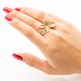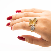 این انگشتر نقره 925 با طراحی الهامگرفته از طبیعت و شکل گل، اثری بینظیر از هنر و ظرافت است که توسط آرتیسان گلد ارائه شده است. ساخته شده از نقره استرلینگ با عیار 925، این انگشتر از 92.5 درصد نقره خالص و 7.5 درصد آلیاژهای مقاوم تشکیل شده که تضمینکننده دوام، درخشش و مقاومت در برابر تغییر رنگ است. طراحی این انگشتر با گلبرگهای طلایی مات و نگینهای ریز درخشان در بخش مرکزی، ترکیبی از elegance و مدرنیته را به نمایش میگذارد که آن را به گزینهای ایدهآل برای استایلهای روزمره، مجالس یا هدیه دادن تبدیل کرده است. آبکاری طلایی ظریف و بافت خاص گلبرگها، جلوهای لوکس و طبیعی به این جواهر بخشیده است.