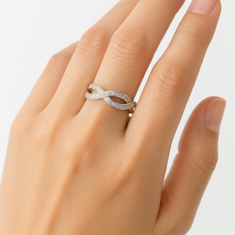 تمام سطح موجها با نگینهای زیرکونیا درجهیک کار شده که از نظر درخشش، بسیار نزدیک به برلیان دیده میشوند و زیر نور، برق ظریفی روی انگشت ایجاد میکنند. استفاده از نقره ۹۲۵ و آبکاری باکیفیت، علاوه بر جلوهی جواهری، دوام و مقاومت حلقه را هم بالا برده است؛ بهطوریکه میتوانید آن را ساعتهای طولانی بدون ایجاد حس سنگینی یا ناراحتی روی دست داشته باشید.