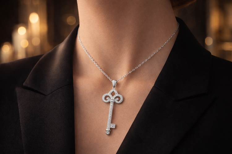 گردنبند نقره ۹۲۵ طرح کلید اقبال فِلور-فِلور نگین‌دار با زیرکونیا (زنجیر ۴۲ سانت)
