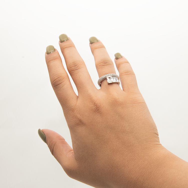 این انگشتر نقره عیار ۹۲۵ با طراحی کلاسیک و لوکس، گزینهای ایدهآل برای علاقهمندان به زیورآلات ظریف است. نگین اصلی مستطیلی شفاف (احتمالاً زیرکونیا یا کریستال با برش دقیق) روی بدنه نقرهای براق قرار گرفته و با ردیفی از نگینهای ریز درخشان روی حلقه، جلوهای باشکوه و الماسمانند ایجاد میکند. وزن تقریبی ۵-۷ گرم و سایز قابل تنظیم، آن را برای استفاده روزمره، نامزدی یا مجالس رسمی مناسب میسازد. این انگشتر نقره زنانه برای بانوان شیکپوش، کسانی که به دنبال حلقه نامزدی اقتصادی اما زیبا هستند و عاشقان جواهرات کلاسیک، ایدهآل است.