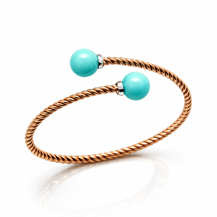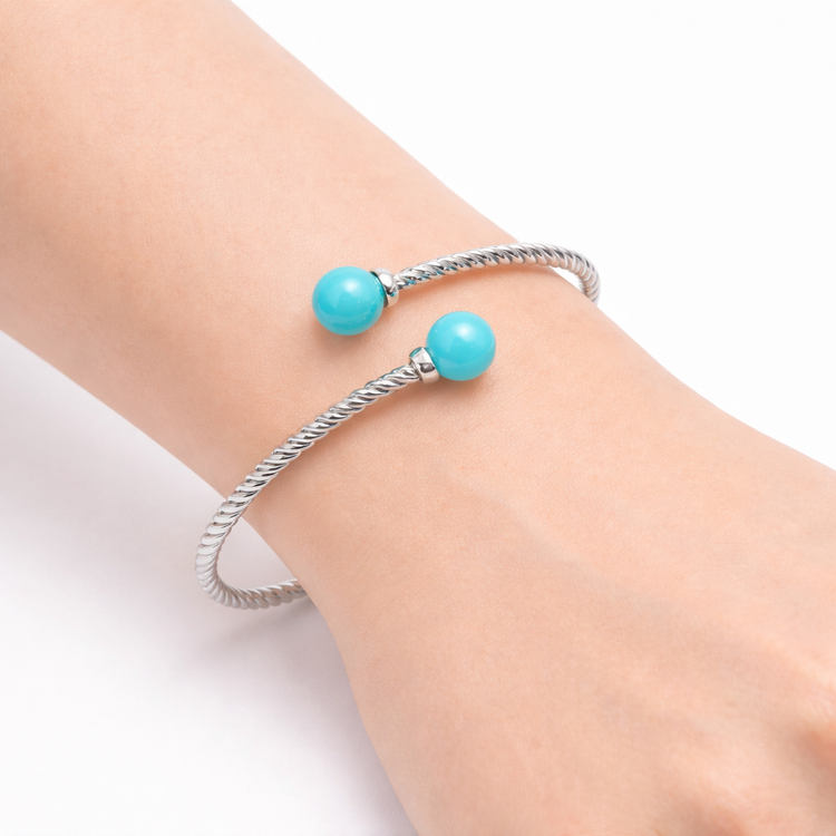 این دستبند نقره عیار ۹۲۵، یکی از جواهرات دستساز و نفیس وبسایت آرتیسان گلد است که با طراحی مینیمال و الهامگرفته از هنر سنتی ایرانی، ترکیبی بینظیر از زیبایی و اصالت را به نمایش میگذارد. بدنه دستبند از نقره استرلینگ عیار ۹۲۵ ساخته شده که حاوی ۹۲.۵% نقره خالص و ۷.۵% آلیاژهای مقاوم مانند مس است، تا دوام بالا و درخشندگی طولانیمدت را تضمین کند – بدون اینکه نرمی نقره خالص باعث تغییر شکل شود. طراحی آن به صورت باز و مارپیچی (طرح تورک) است که به راحتی روی مچ دست قرار میگیرد و با دو توپ فیروزه آبیرنگ سنتاتیک تزئین شده؛ این توپها با قطر حدود ۸-۱۰ میلیمتر، نمادی از آرامش و حفاظت در فرهنگ ایرانی هستند و وزن کلی دستبند را به حدود ۱۰-۱۵ گرم میرسانند. فیروزه نه تنها زیبایی بصری خیرهکنندهای به دستبند میبخشد، بلکه با خواص درمانی مانند کاهش استرس و افزایش انرژی، آن را به زیورآلاتی معنادار تبدیل کرده است. این محصول با آبکاری رودیوم برای جلوگیری از تیره شدن، گواهی اصالت و بستهبندی لوکس عرضه میشود