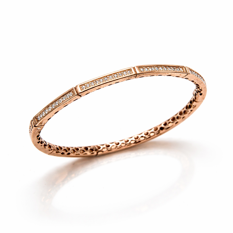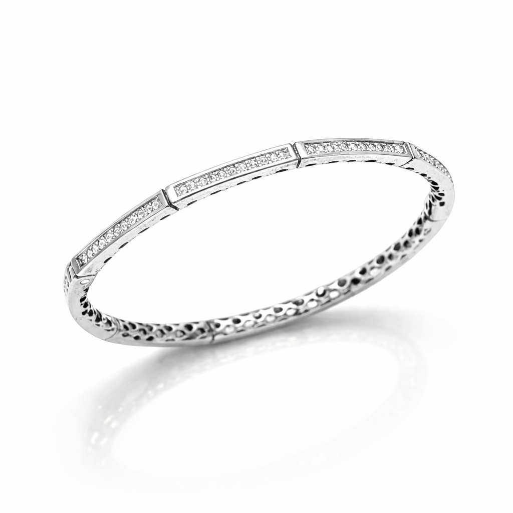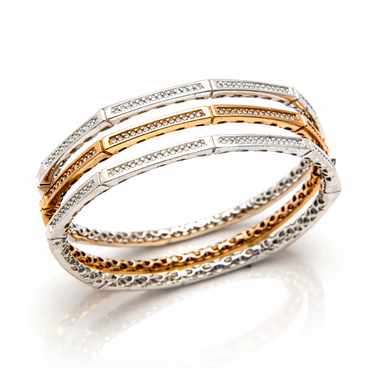 این مجموعه دستبندهای نقره عیار ۹۲۵ از وبسایت آرتیسان گلد، شامل بانگلهای سفت (رigid) قابل انباشت (stackable) در رنگهای نقرهای و رزگلد است که با طراحی مدرن و لوکس، ترکیبی از زیبایی کلاسیک و contemporary را ارائه میدهد. بدنه از نقره استرلینگ عیار ۹۲۵ ساخته شده (۹۲.۵% نقره خالص با آلیاژهای مقاوم برای جلوگیری از تغییر شکل و تیره شدن) و با آبکاری رودیوم (برای رنگ نقرهای) یا رزگلد برای تنوع رنگی، دوام بالایی دارد. هر بانگل با نگینهای کوچک کریستالی یا زیرکونیا (cubic zirconia) در ردیفهای پاوه-set تزئین شده که درخششی شبیه به الماس ایجاد میکند؛ طراحی сегментиشده (چند وجهی) آن حدود ۶-۸ میلیمتر عرض دارد و وزن هر کدام حدود ۱۰-۱۵ گرم است. این محصولات دستساز با گواهی اصالت، قابل تنظیم برای مچهای ۱۶-۱۹ سانتیمتر، برای ست (بسته به تعداد و نگینها) عرضه میشوند. ایدهآل برای لایهبندی با دیگر زیورآلات و مناسب استفاده روزانه یا مجالس.