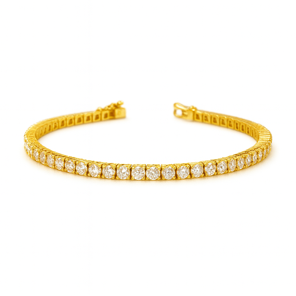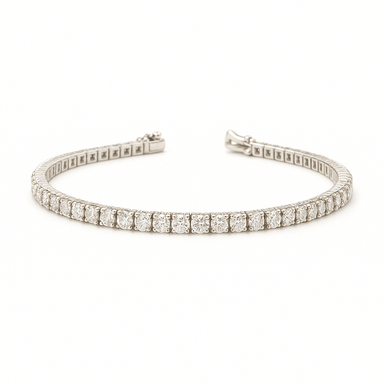 این دستبند تنیس ظریف و لوکس، با ردیفی منظم از نگینهای زیرکونیا درجهیک ساخته شده که از نظر کیفیت، درخشش و نوع تراش، شباهت خیرهکنندهای به تراش برلیان دارند.