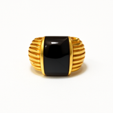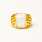 اولین چیزی که در برخورد با انگشتر نقره آبکاری طلا مدل آورا جلب توجه میکند، طراحی حجیم و معماریشدهی آن است. بدنهی شیاردار طلایی، از دو طرف نگین مستطیلی مرکزی را در آغوش گرفته و حس یک انگشتر گالریپسند و کاملاً استیتمنت را منتقل میکند. این فرم پهن و قوسیشکل باعث میشود آورا روی دست، شبیه یک اثر طراحیشدهی خاص به نظر برسد، نه فقط یک حلقهی ساده. اگر به دنبال انگشتر زنانه لاکچری هستید که در نگاه اول متمایز باشد، آورا دقیقاً همین نقش را بازی میکند.